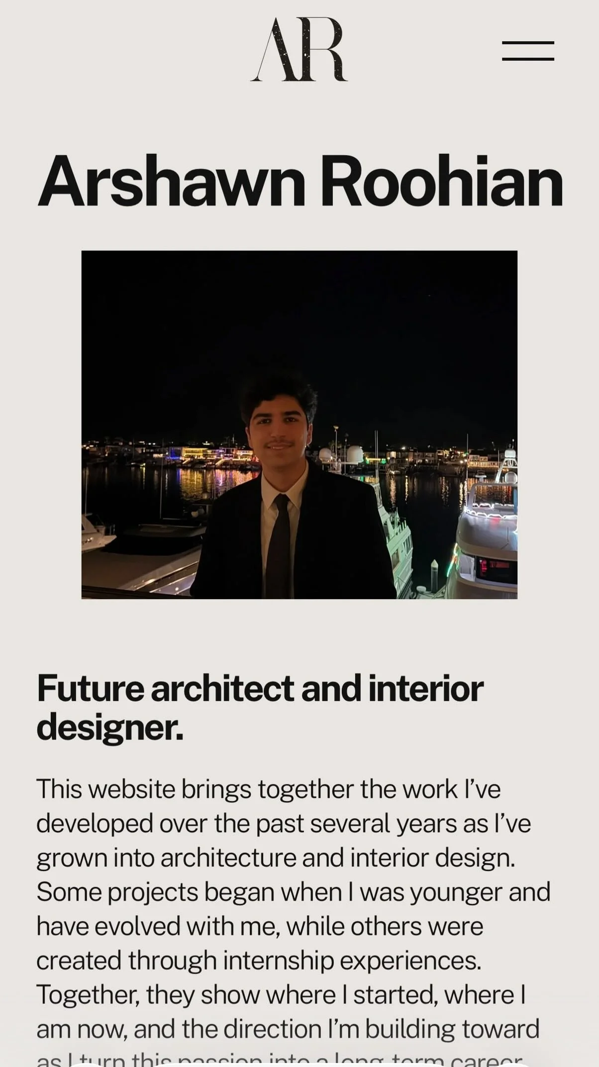 For almost two years, I interned at Jen Samson Design, working alongside renowned interior designer Jen Samson and her team. There, I assisted with material sourcing, concept development, presentations, and client-related tasks, getting a real exposure to the pace and expectations of professional interior design. I also worked alongside Iraj Roohani at Pelican Developers Inc., a homebuilding company, where I observed the residential construction process and gained a deeper understanding of how design decisions translate into real structures. These experiences confirmed that this is the field I want to build my career in. My goal is to pursue a Master of Architecture and eventually build my own firm that brings architecture and interior design together under one clear vision.